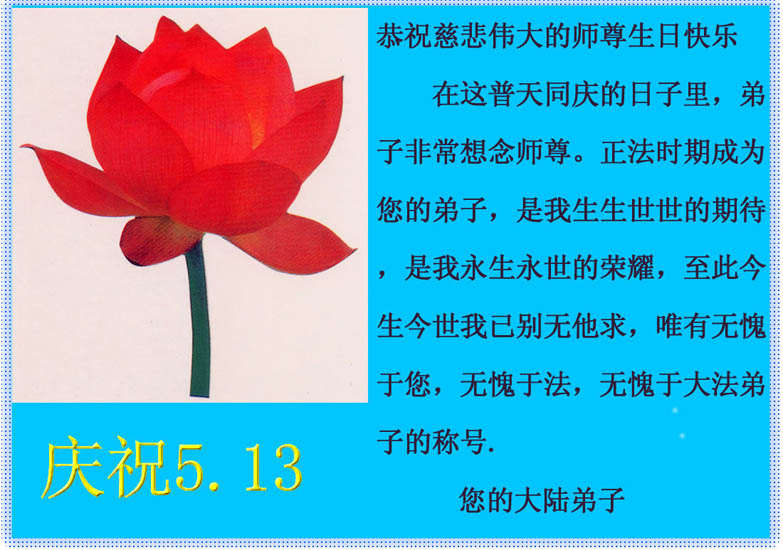 感谢师尊慈悲苦度,弟子一定会加紧做好三件事,不辜负师父的慈悲救度。 黑龙江省安达市大法弟子恭祝师尊生日快乐!普天同庆世界法轮大法日!