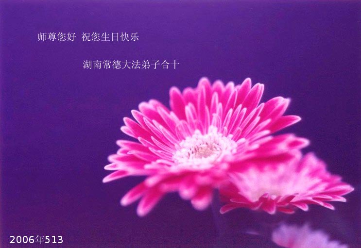 慈悲伟大的师尊: 在普天同庆513世界法轮大法洪传十四周年的伟大时刻,向师尊表达最崇高的敬意。恭祝师尊生日快乐!师父您为我们受苦了。弟子唯有精進,报答师父救度之恩。 湖南常德大法弟子合十 2006年5月11日 福建省全体大法弟子恭祝师父生日快乐