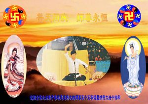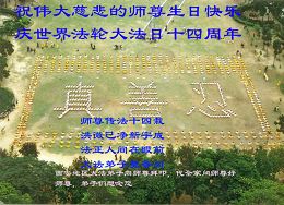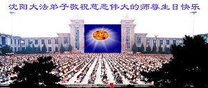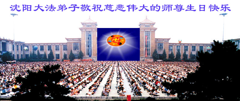 祝法轮大法洪传十四周年。 敬祝师尊生日快乐! 沈阳地区大法弟子恭祝慈悲伟大的师尊生日快乐!共贺世界法轮大法日!