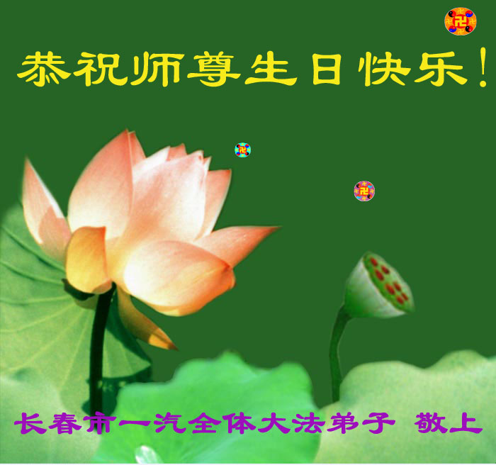 恭祝师尊生日快乐! 我们热烈庆贺法轮大法洪传十四周年,这是世界众生大法弟子的神圣节日!自1992年大法开传到现在,为了法正乾坤,为了救度众生,为了我们从人走向神,师父操尽了心,吃了无数的苦,为众生为我们承受了很多很多,真是佛恩浩荡!我们对师父的感激之情无以言表! 虽然经过了风风雨雨,但在师父的慈悲呵护下,总算走过来了。我们决心信师信法,听师父的话,师父怎么说,我们就怎么做。请师父放心,我们保证做到不懈怠、不放松、不麻木。正念正行,走好最后的路! 山东滕州市全体大法弟子 长春大法弟子恭祝师尊生日快乐!