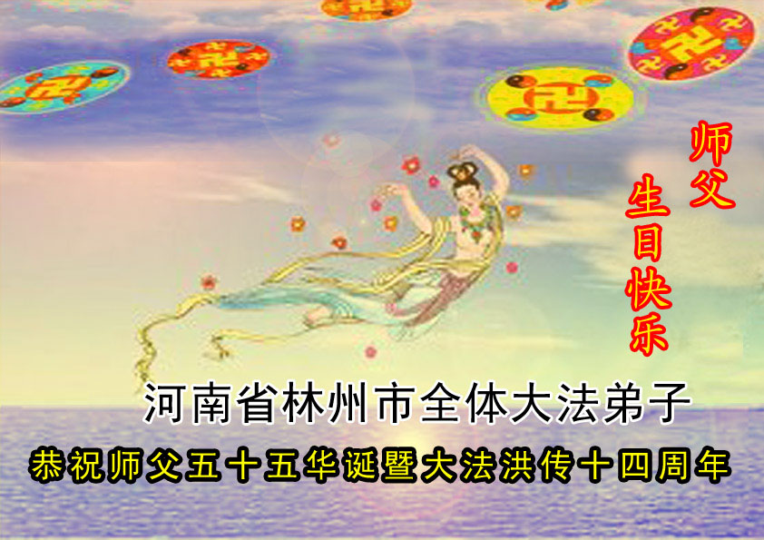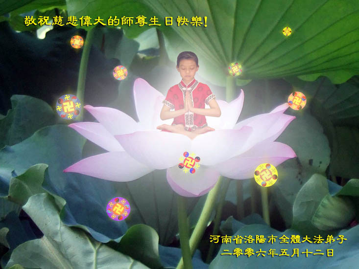 在师尊生日和世界法轮大法日到来之际,祝伟大的师尊生日快乐,祝全世界的大法弟子节日快乐。 四海同欢歌,大穹共庆贺,在这伟大的节日里,让我们共同庆贺。 师父,弟子想念您。 洛阳市全体大法弟子恭祝师尊生日快乐!
