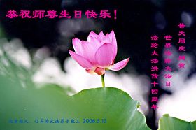 恭祝伟大的师尊生日快乐! 祝贺第七届世界法轮大法日! 广东省客家大法弟子敬贺 合十 2006年5月11日 怀化地区全体大法弟子恭祝慈悲伟大的师尊生日快乐!