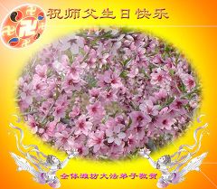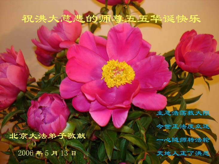 值此师尊55华诞暨大法洪传14周年之际,我们北京海淀区、丰台区大法弟子祝师父生日快乐! 2006年5月11日 四川省成都市新都区全体大法弟子祝师尊生日快乐!