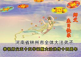 请师尊放心,我们一定要努力做好三件事,跟上师父的正法進程。 山东滨州全体大法弟子敬上 2006年5月12日 河南省林州市全体大法弟子祝师父生日快乐!