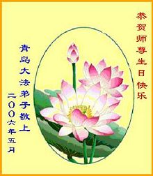 廊坊大法弟子向慈悲伟大的师尊问好!祝贺师尊生日快乐!在这普天同庆之际,我们要向师尊说:请师父放心,无论邪恶怎样,我们都不会动摇,坚修到底,做好“三件事”,精進不止,不辜负师父的慈悲苦度!兑现我们的史前大愿! 廊坊大法弟子合十 2006年5月12日 青岛大法弟子恭祝2006年世界法轮大法日