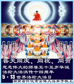 庆贺大法洪传十四周年暨世界法轮大法日! 千言万语道不尽我们对师尊的感恩之心,师尊辛苦了!我们一定谨记师尊教导做好大法弟子应做之事,不负师尊期望,了却来时大愿! 2006.5.11 石家庄大法弟子恭祝慈悲伟大的师尊生日快乐!