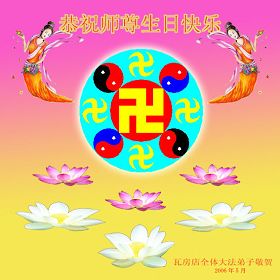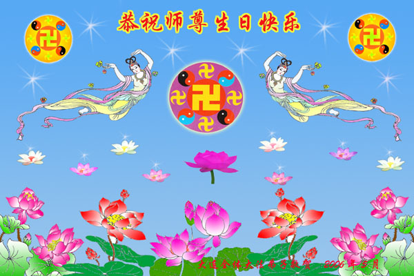 伟大的师尊:生日快乐! 青岛大法弟子敬上! 合十 同时祝愿全世界的大法弟子第七届世界法轮大法日快乐! 2006年5月2日 黑龙江省佳木斯市大法弟子恭祝师尊55华诞快乐暨法轮大法洪传十四周年!