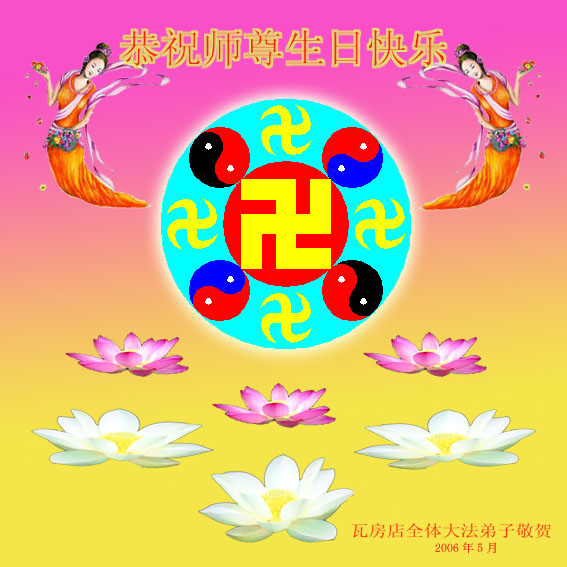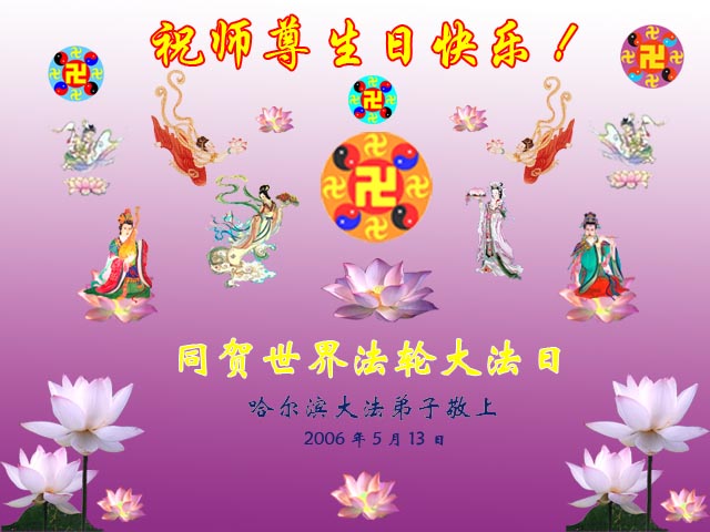 师尊,您好!是您把我们从地狱里救起,替我们承担了生生世世的无边的罪业,是您给我们搭好了回家的阶梯,用洪大的慈悲给弟子们百般的呵护。无知的世人在邪恶的欺骗下对您做出了不公正的评价,甚至是诽谤、谩骂,而您还是要我们讲清真相救度于他。师尊啊,您为众生操尽了心,却从不求一丝丝的回报。弟子们知道,唯有信师信法,整体配合用强大的正念解体一切邪恶的干扰,做好三件事 ,才是对师尊最好的报答。请师尊允许弟子借明慧网的一角向您表示迟到的祝福:恭祝慈悲伟大的师尊生日快乐!祝贺第七届世界法轮大法日! 武清全体大法弟子叩拜 2006年5月12日 辽宁岫岩全体大法弟子恭祝师尊生日快乐!普天同庆大法洪传十四周年!!!