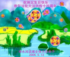 在喜庆2006年5月13日世界法轮大法日到来之际,四川成都市全体大法弟子恭贺慈悲伟大的师尊传法十四周年! 向师尊问好! 向全世界大法弟子问好! 成都全体大法弟子合十 二〇〇六年五月十一日 重庆长寿地区大法弟子敬祝慈悲伟大的师尊生日快乐