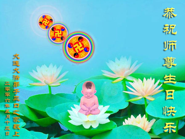 我们会更加精進的走好以后的路,做好学法、发正念、讲真相三件事,请师尊放心! 2006年5月12日 大连大法弟子三口之家恭祝师尊生日快乐