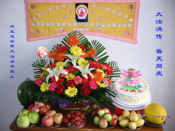 山东省荣成市全体大法弟子祝伟大的师尊生日快乐!庆祝法轮大法洪传十四年!