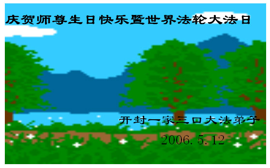 也祝各同修好,让我们勇猛精進,做好三件事,不辜负师父的期望,做一个合格无漏的大法徒。 桂林大法弟子 2006-5-12 河南省潢川县全体大法弟子敬祝师父生日快乐