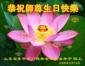 弟子衷心的向慈悲伟大的师父道一声谢谢!师父对弟子的苦心救度之恩,难以用言语表达,千言万语汇成一句话:做好三件事,勇猛精進报师恩。 山东省临朐县老年大法弟子敬上 2006年5月12日 北京大法弟子全家恭祝慈悲伟大的师父生日快乐!