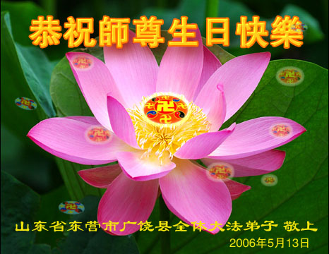 无论前路如何艰险,弟子们都会坚如磐石地跟着师尊一走到底! 顶礼合十 广东韶关大法弟子 2006年5月9日 山东莱芜市大法弟子敬祝师尊生日快乐!祝贺大法洪传1
