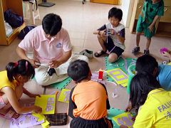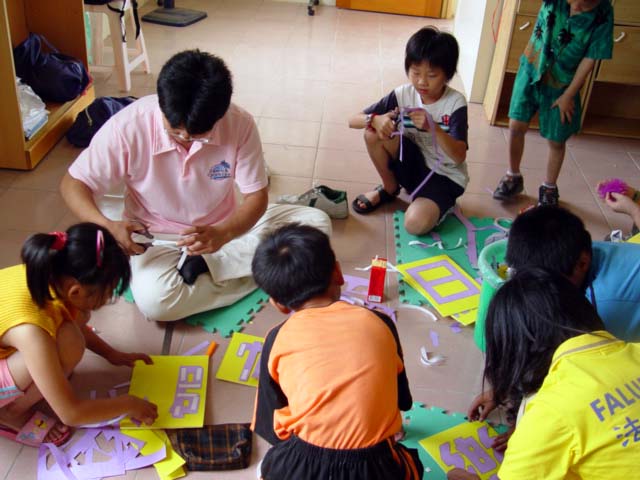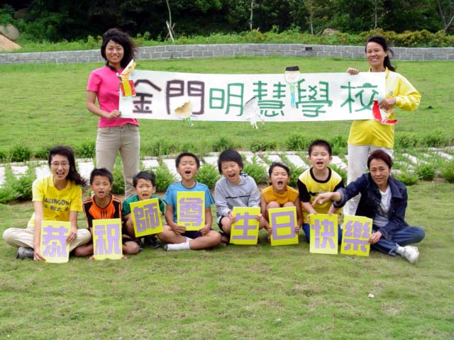 | 【明慧网2006年5月14日】几年前,金门法轮功学员就曾经成立“明慧乐园”提供给大法小弟子及不修炼的社会人士的孩子们一个学法修炼的环境,但诸多的干扰,办办、停停的。近期虽然大法项目增多,但体悟到为小弟子们营造一个“比学比修”环境的重要性,金门的明慧学校于今年又开办了,每个星期六下午二点至五点,有条件的小弟子们聚集在一起,在大法的熔炼中共同精進。 五月十三日,星期六,这天正好是师尊的生日,金门的明慧小弟子们忙忙活活的割字、贴字,准备合影为师尊祝寿。 “胡老师,我每年的五月十三日这天都不打电脑(游戏)了。”二年级的亦伦天真的说着。 “为什么?” “因为师父生日,要让师父高兴呀!” “我也有计划哦!”同是二年级的韵琪一边纯熟的剪着字,一边喜滋滋的说着。 “我五月都不要看电视,我本来是想五月十三日一天不看电视的,和奶奶讨论后,奶奶说一天没有诚意,所以我就决定整个五月都不看电视。” 听着孩子真诚的童言童语真令我惭愧,这“比学比修”的环境,不只是给孩子们的,对带领孩子的我们也起着很大的促進作用,这两位都是得法才几个月的小弟子呢! 其他小弟子们陆陆续续的来了,一听说要帮师父祝寿,大家兴高采烈的帮忙着。 拍完照后,大家学完〈论语〉准备進行下一个课程,坐在我旁边的燕强,小声的说:“师父生日,要写信给师父。” 小弟子们的敬师之心,又一次震撼着我的心灵,于是,我请孩子们说说想对师父说的话,并允诺透过网路的方式,替他们表达对师父的心意。 燕强首先说:“我要祝师父生日快乐,健健康康!” 慧君说:“我要跟师父说我喜欢你,祝师父天天乐乐!” “你们觉得怎么样师父才会快乐呢?”我顺势提问着。 “就是大家好好的学法炼功呀!”大家异口同声的说着。 感谢慈悲伟大的师尊,让弟子有机会和小弟子们共同精進,我一定会带好小弟子们,并做好师父交待的三件事,不辜负师父的慈悲救度。