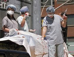 | 【明慧网2006年5月31日】2006年5月27日,法轮功学员在加拿大多伦多市中心举行庆祝法轮大法洪传世界14周年的游行,加拿大多伦多博克(BlogTO)网上刊登了一则网志,网志上用照片记录了法轮功学员在多伦多市举行的活动。 网志上写道,在一辆卡车上,游行参与者们在演出行动剧。车上的标语牌写着:中共屠杀法轮功学员并摘取他们的器官。  花车 |  游行队伍 |