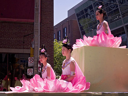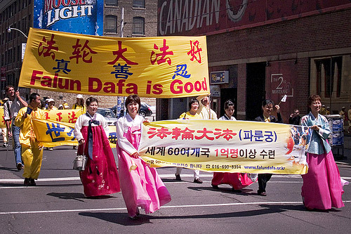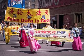 在另一个花车上,法轮功支持者身着绚丽的服装,车上写着“真、善、忍”,“法轮大法在加拿大”。 网志上还说,法轮功也称法轮大法,是包括打坐和炼功的功法,修炼真、善、忍。参与游行的人向人们散发介绍法轮功,以及在中国发生的迫害的传单。