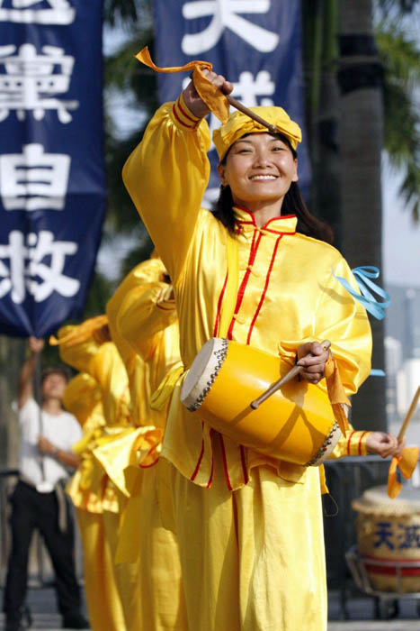 | 【明慧网2006年5月7日】2006年4月28日,我们一团41人,从台湾飞抵香港,参加声援千万人退出中国共产党的活动。我们负责的项目是打腰鼓,深知此行任务特殊而神圣,不管在飞机上或游览车里,我们这个团体安安静静的,没有任何嬉戏、笑闹声,与一般旅游团体明显有别。 我们远赴香港参加游行,肩负着除恶救世人的重任,希望充满“真、善、忍”的法鼓声,震醒置身迷中的芸芸众生,震醒那些尚未退出中共的中国人。 抵达住宿的饭店时,已经是29日凌晨将近两点了,等我们铺好床、打理好行李,即将天亮了。有些人一夜无眠,有些人小睡片刻,但是大伙儿依然准时4点50分在广场上集体炼功。 我们的行程非常紧凑,29、30日两天,早上集合了来自各地的腰鼓队整体练习,下午在香港参加了两场“庆祝千万勇士退出共产党”的游行活动,来自海内外1500人参加了这场盛会。周六游行由维多利亚公园出发,走到中环皇后码头;周日游行则由九龙深水步(土步),经太子、旺角、油麻地、佐敦,游行至尖沙咀天星码头,队伍行经之处,都是香港最热闹的繁华地段。 腰鼓队雄姿焕发,神气活现,令人耳目一新;深具传统特色的金黄色服装与腰鼓格外亮丽耀眼;队伍中有年长的银发族,也有快乐的小朋友,男男女女、老老少少。整齐划一的步伐,和谐的音韵与节奏,把法轮大法的美好与“真善忍”的种子,散播在香港街道上,深深撼动着驻足观赏的民众。 腰鼓队的演出,震撼了观赏人潮,在阵阵喝彩声中,久久不肯离去。笑容满面的观众,翘首以待,拍照、摄像者,此起彼落。沿街的警察,更是频频叫好,有的微笑致意,有的挥手表示赞许。 腰鼓队从早上九点半集合练习到下午五点游行结束,历经七个多小时。长时间的活动中,所有的学员不曾稍有松懈,大伙儿甚至没吃中餐,没有人叫累、喊饿,一整天喝喝白开水是我们最满足的享受。 我们没有音乐素养或乐器基础,来自各行各业,来自不同的社会阶层;其中更多的是文化水平不高、儿孙满堂的银发族。要呈现这样高水准的表演,背后的辛酸与刻苦,如人饮水,冷暖自知。我知道这一切都是因为我们在大法中熔炼,我们有着共同的信念:救度众生。 |