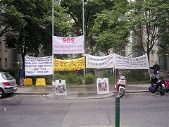 | 【明慧网2006年6月12日】2006年5月26日,在维也纳的中使馆招待一批中、奥重要人物之际,奥地利的法轮功学员在使馆门前拉起了一条灯链。所有的来访者都看到了学员们挂起的横幅,其中包括揭露中共活体摘取法轮功学员器官的内容。不少访客和法轮功学员交谈,对发生在中国的迫害表示关注。 一位刚刚离开使馆的上了年纪的女士向学员说,她在里边时,让每个在中使馆内做客的人都看外面的横幅。 一位刚要进入中使馆的女士也非常严厉的谴责了中国人权问题。她说:“这简直是难以置信,无法想象现今中共政权还会犯下怎样的迫害人权的罪孽。” 另外一名从未听说过法轮功的来访者当即索要所有有关迫害及盗取器官方面的详细资料。他表示说,人们有义务将中共的盗取器官行为公诸于世。 一位出租车司机将车停在学员的活动地点前,向他们竖起大拇指说,“你们干的好,继续坚持下去。” 一位从中使馆出来的中国女士来到横幅前,她仔细的看了所有的横幅。与她攀谈的中国学员告诉其他同修说,这位女士是她的一位旧识。她们已经有十多年没见过面了。她一直都想要找到这位女士,并跟她讲法轮功的事,遗憾的是,迄今为止都没能如愿。然而今天机缘巧合之下,她们再度重逢,她非常高兴终于得偿所愿。