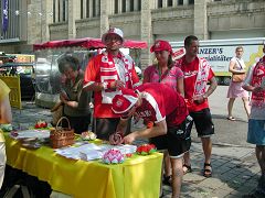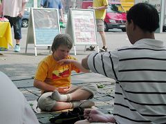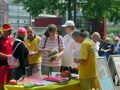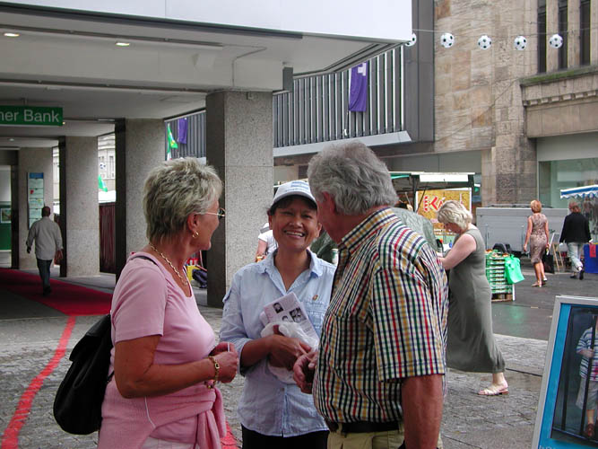 | 【明慧网2006年6月17日】2006年6月9日至7月9日,四年一度的世界杯足球赛在德国举行。德国北威州(Nordrhein-Westfalen)的多特蒙德市(Dortmund)是12个主赛城市之一,6月10日和14日在这里举行两场足球赛,据悉,有来自欧洲以及世界各地的逾二十五万球迷和足球爱好者来这里观赏球赛。北威州的部份法轮功学员在此期间于多特蒙德市中心的繁华地带举办了洪法讲真相信息台活动,借此时机向更多的世人讲真相,揭露中共恶党对法轮功实施的灭绝人性的迫害,以唤起更多民众的关注,使这场迫害得以尽快被制止。 一如往常,学员们准备了横幅、大字真相条幅、图片和传单,除此之外还特别准备了波兰语、意大利语、英语等不同语种的传单,向非德语国家的人们派发;有些学员还赶制了很多精美的纸莲花和书签赠给喜爱者,以将真相信息传递的更深入更广泛。学员们相互配合默契,讲真相、征集反迫害签名和展示功法有序的进行。 一对老年德国夫妇听学员讲述中共迫害法轮功,并活摘法轮功学员器官牟取暴利的骇人内幕时表示,对中共这种灭绝人性的残酷迫害他们毫不怀疑,并说,哪里有共产党,哪里就会有灾难,他们是深有体会的。原来这位德国妇女就是翻越原柏林墙从东德逃过西德来的。为了实际表示他们对中共共产专制的抗议和对法轮功学员反迫害的支持,离去时他们又要了几份传单,要拿回去给邻居发送。 这两天的多特蒙德市里,着特色服装和特别饰物的足球迷们三五成群,满街都是。一组德国球迷耐心的听学员讲真相,问清楚了法轮功是什么,为什么受迫害及中共恶党的实质后,毫不犹豫到信息台前签名反对迫害。一组波兰球迷了解真相后也一一签名反对迫害。 真相台前还来了一位刚刚从国内探亲回来的中国同胞,向法轮功学员讲述了自己的震惊。回国前,这位同胞也曾得到过有关中共监狱活摘法轮功学员器官的真相传单和报纸,但是并不相信这会是真实发生的事。在国内探亲期间,他从一个当医生的至亲那里得知,本城市多所医院不仅能做器官移植,而且三天就能得到各种器官。在天安门广场时,刚进到某一范围,马上就有便衣跟上他们了,游兴全无,气氛非常恐怖。他直对学员说:实在太坏了!实在太坏了!离开前特意向学员要了各种真相材料,要拿回去认真读一读,了解更多的真相。 在讲真相揭露迫害的同时,法轮功学员们展示的祥和舒展的功法也吸引了不少民众,不时有人询问在哪里学功。两位中年德国妇女签名支持法轮功后并无意离去,一位妇女边看炼功边告诉学员说:这个功真好!我也喜欢气功,参加过几个班,但是这个功我更喜欢。当得知法轮功简单易学,而且还不收任何费用时,立刻问在哪里可以学功,从当地学员处得到学功详址和时间后,她才满意离去。 还有一个德国小男孩,向学员提了好些有关法轮功的问题后,又坐到炼功学员对面,学习打坐。小男孩好象还满有些定力,约五六分钟后他还在单盘打坐,偶尔微微睁开一只眼,看看对面的学员,调整一下自己的动作,又闭上眼睛继续打坐。