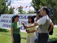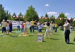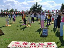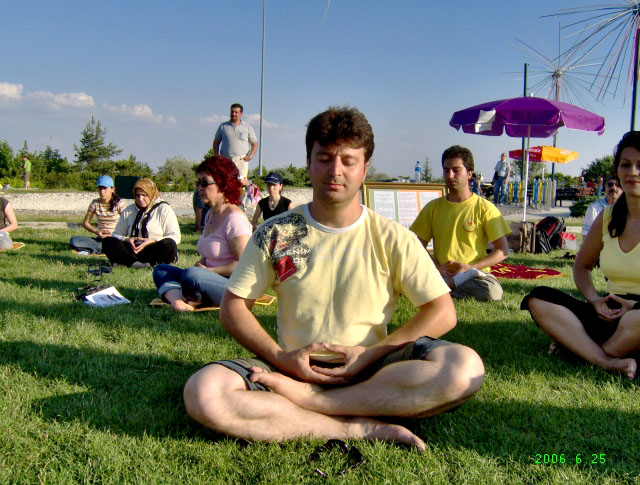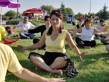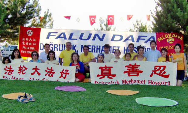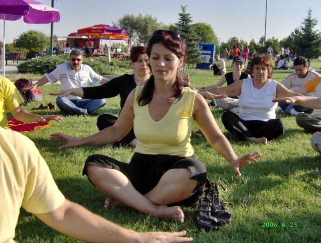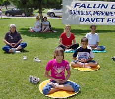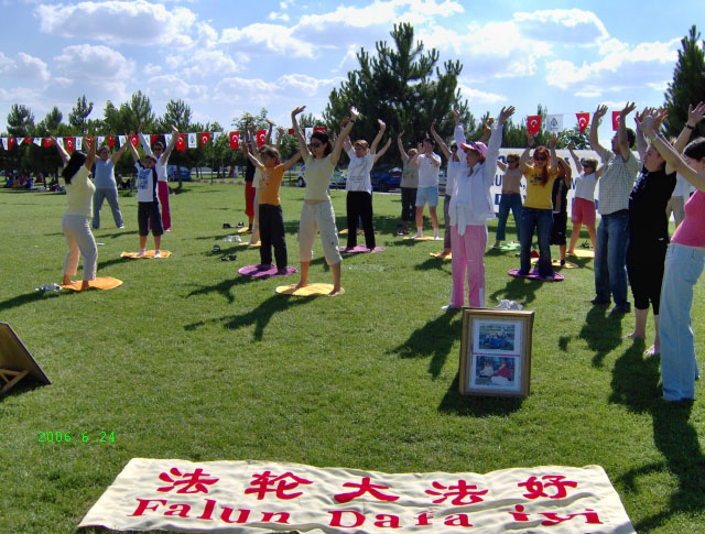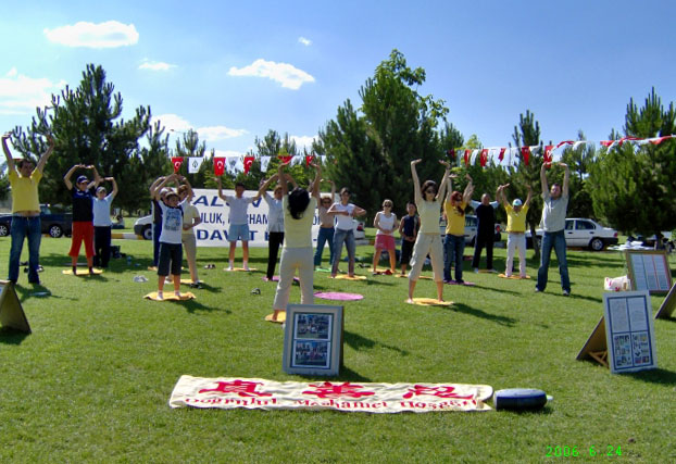 | 【明慧网2006年6月30日】2006年6月24、25日,土耳其三个城市的新老法轮功学员一起,在安卡拉一个公园里洪法。三个城市的学员齐心合力各尽所能,有的布置场地,有的演示功法,有的义务教功。土耳其三个城市的新老学员,在安卡拉的一个公园里,一起炼功、洪法。土耳其三个城市的新老学员,在安卡拉的一个公园里,一起炼功、洪法。 这两天天空晴朗,蓝天白云下,在公园碧绿的草地上,“法轮大法”、“真善忍”等白底蓝字的横幅,格外瞩目。其中一条写着“法轮大法 真善忍 邀请您参加”的横幅,是MERSIN市的法轮功学员,通过多次向政府讲真相,由政府出资赞助的。一位批准公园使用许可证的官员并说,以后,安卡拉所有的公园,你们都可随意使用。  记者采访 |  记者采访 |