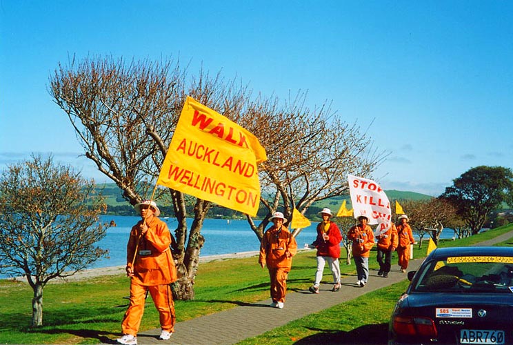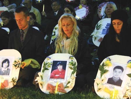 | 【明慧网2006年7月21日】(接前文) 二、让我们共同为历史作证——记中领馆前2555天的和平请愿 在七年前的那个七月,出于极端妒嫉的江氏不顾百姓的福祉,利用喉舌媒体编造种种谎言,动用整部国家机器发动了这场史无前例的对法轮功修炼人的血腥迫害。 “作为法轮功的受益者,我们为那么多世人还来不及知道法轮功是什么、对人有多珍贵而遗憾;为那些被中共的谎言蒙蔽对法轮功做了不好的事,对自己生命造成深重危害的人痛心。其实,这并非复杂问题:人与人之间都真诚、善良、宽容相待的世界好不好?‘真善忍’的原则该不该去实践和展现?在他遭到诋毁时,该不该去坚守和维护?事实上,七年来法轮功学员的反迫害,就是告诉世人法轮功是什么和被迫害的真相,就是在这过程中实践和坚守‘真善忍’的原则。大法的珍贵和殊胜,令真修者无论在任何压力下、在任何危难中都为之舍命而不足惜。”——法轮功学员的心声 这场迫害发生之初,中国大陆各地的法轮功学员本着善心,依据宪法赋予的权利进京上访、到天安门广场和平请愿,告诉政府和民众法轮功是好的,希望能够制止迫害,能有自由修炼的权利。但所有上访渠道都被堵死,信访局和天安门广场成了抓捕法轮功学员的场所,上访学员被非法绑架、关押、毒打甚至被折磨致死,很多人一去不返,杳无音讯,可他们依然前仆后继。面对中共利用国家机器在全球范围内的施压和收买,海外法轮功学员在世界各地讲真相,揭露迫害,用各种方式唤醒世人良知,呼吁关注并制止迫害,以声援和营救在大陆受难的同修。  SOS步行紧急营救在大陆受难的同修 |  烛光守夜悼念遇害同修 美国华盛顿DC |