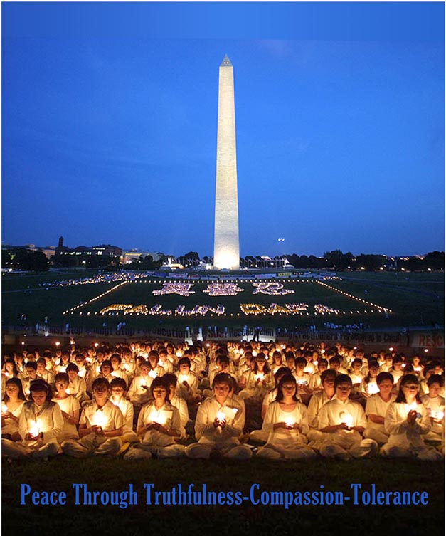 请与我比邻同坐 共同面对那血雨腥风 让我们一同默默地呼唤 真善忍的回归 这首诗以不同语言出现在中国驻海外各国使领馆前的和平请愿展板上。无论在漫天飞雪的寒冬,还是在骄阳似火的酷暑,日复一日,年复一年,他们或静静打坐炼功,或给路人发放资料、讲述法轮功真相。如今2555天过去了,这和平抗议已延伸到了四大洲的几十个国家的中国使领馆前。参加者种族、年龄、身份各异,他们中有九十多岁的英国老爵士,有尚在父母怀中的稚子,有国际知名公司的经理,有在家相夫教子的主妇……,共同的是他们维护“真善忍”的理念和希望世人不受谎言迷惑的善心。  冰天雪地里渥太华中国使馆前的烛光悼念 |