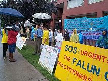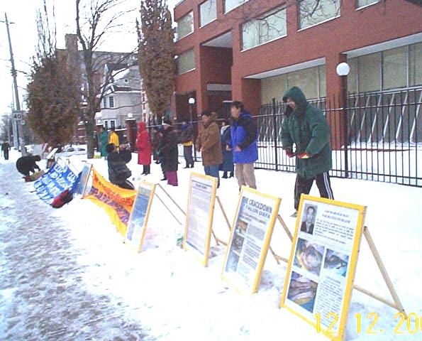 * 在领馆前的日日夜夜 加拿大多伦多学员李女士:“我们多伦多学员是从1999年7月开始去中领馆炼功请愿的。不明真相的人说,你们要炼功回家去炼,干吗天天来这儿?你们不是在抹黑中国吗?我说,使领馆是中国政府在海外的窗口,我们来不是为反对中国,恰恰相反,我们因深爱着中国才来这里,来告诉中国政府法轮大法是什么,对人有多珍贵。我天天带着这本《转法轮》,法轮功就是教人按‘真善忍’做好人的理和这五套功法,中国政府迫害信仰‘真善忍’的好人错了。 2000年有历年积雪最长的冬天,纷飞的大雪,时常大到看不清对面人的模样。有个女学员平时从家开车去领馆用一个半小时,可一次大雪天,她竟开了四个小时。等她赶到领馆,集体炼功已结束,她又花四个小时回家。可这并没影响她每天来领馆,因为她知道她的心苍天可鉴。有位同修的车在大雪的冬夜熄火了,后来他冒着鹅毛大雪步行走到领馆接班。 2001年的春天,雨天比往年来的多,风疾雨大,学员们的衣服常常从里湿到外,在倒春寒的日子,这承受可想而知。可雪越大、风雨越疾,来炼功的人越多,大家的心也越齐。一次,有两个华人在领馆门前冻得直跺脚,一个说:这样的天还来炼功,给多少钱我也不干。学员告诉他们:我们都是自愿来的,没拿过别人一分钱,看看我们的报纸吧,你就知道我们为什么要来了,这也是大家省吃俭用积攒的钱印的。那两人不好意思地接下了报纸。” 多伦多领馆前的和平请愿炼功多伦多的法轮功学员毛女士:“一次,我们约见了领馆的官员,我们诚意地跟她讲我们的修炼经历和感悟,修炼人的善良、隐忍感动了她,她也向我们道出真心话:她父亲是中共高层干部,也在炼法轮功,很多高层干部和配偶都在炼,其实大家心里都清楚。就象4.25,江罗集团不打压法轮功,怎么会有那么多不同身份背景的修炼人去国务院信访办请愿。整个过程那么有秩序,那么和平,离开时地上连个纸片都没留下,这有目共睹。这哪是中共靠号召、命令能做到的?这算什么围攻?不过是因为法轮功太正,炼的人太多太坚定,江氏又嫉妒又害怕,他不顾其他六个常委的反对,一意孤行要镇压,害得我们都难做好人……。最后她收下了我们送她的《转法轮》,说要认真研究。” 然而,江罗集团对法轮功的迫害却在不断升级,610特务机构在全国范围秘密下达了江氏对法轮功学员“肉体消灭”、“打死白打死,打死算自杀,不查身源,直接火化”的灭绝密令,用谎言煽动仇恨,用物质利益驱使不法人员将暴力作为“转化”法轮功修炼者的主要手段,无所不用其极的酷刑、性虐待,甚至直接谋杀手段的暴虐超乎人之想象。 李女士:“2001年6月中,哈尔滨万家劳教所计划在7月20日前全部转化被非法关押的法轮功学员。女学员们被狱警用电棍、武装带毒打,被连续几昼夜‘吊飞机’、甚至被男警当众亵侮、抬进男监由男犯轮奸……随后,15名女学员被狱方宣称集体上吊‘自杀’,130位法轮功学员绝食抗议迫害,生命危在旦夕。为救援同修,唤起人们对迫害的关注,年近六旬的西人学员康妮从7月开始,在中领馆前连续10天24小时请愿;从8月1日起,十四岁女孩叶瑾和年近七旬的李翩翩老人也开始了为时一个月的静坐,后来又不断有同修加入,他们中有刚参加了长途步行250英里的紧急救援活动的60岁的阿姨,有多伦多大学的女博士生,有天性活泼的13岁男孩……从8月19日开始,同修们又开始连续48或72小时接力绝食绝水请愿。” 叶瑾的母亲毛女士说,女儿从小患丙肝体质极弱,当女儿提出要去静坐请愿时,我知道她身体的承受要有多大,天下母亲的心是一样的,但我和她爸都支持她。李阿姨家住在离这颇远的另一城市,她女儿刚开始心痛妈妈年纪大,担心她吃不消,不情愿她参加。后来妈妈告诉女儿:“你也亲眼看到是大法把我从病痛中解救出来,而现在大法和同修蒙难,我有责任站出来呼吁啊!”后来女儿理解了妈妈,每天花好几个小时接送妈妈。这一老一小用一首简朴的诗来表达她们维护世间正义的心: 老来病困不离身,三尺拐杖颤颤行。 得法身健行如飞,知恩不报枉为人。 小小年纪得丙肝,病魔害我生如死。 大法救我得新生,静坐一月把冤申。 迫害真善忍,民族临生死。 坐碎血肉身,更为救华人。 但求我行动你心, 受尽百苦也甘心。 * 我们的欣慰 从那时起,那群老老少少的身影就陪着日升日落,伴着斗转星移,无论是在四十度的烈日下,还是在零下三十多度的寒夜从没间断。冬天有时手脚冻裂了,夏天晒得掉了皮,学员打趣说,“脸上只有两个眼球是白的”。修炼人的善良、和平与坚韧感动了无数世人的心,越来越多原来不理解的人也逐渐转为钦佩和支持: “请愿之初,领馆的工作人员借给植物浇水为名,故意向我们身上浇水,想赶我们走,把我们老老少少浑身浇得透湿,那可是多伦多的深秋啊,可没有一个人离开,也没人抱怨。慢慢的,有人开始向我们微笑致意,有人悄悄向我们竖起拇指,后来的浇水也停止了。” “一次在中领馆前,我给一个华人报纸,他不但不收,还说了很多难听的话。过了几天,我在附近商场购物时又碰上他,他说:‘我在哪儿见过你,很面熟啊。’我说:‘在中领馆啊,能和你再见面,说明我们挺有缘的。’这次他认真听我跟他讲真相。最后,他笑了:‘第一次见面你给我派报纸,第二次你给我讲真相,第三次说不定我就成法轮功学员了。’” “在领事馆前
