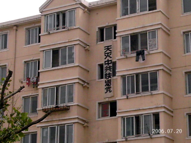 2006年7月20日下午,大连市甘井子区辛寨子挂出了的4米长的条幅。“天灭中共快退!党!”条幅正对着路边的公交车站,人来人往中不时有人盯着条幅看。 “天灭中共快退!党!”条幅2006年3月21日,大连市国家安全局、大连市公安局、甘井子区公安局、辛寨子派出所出动二十多个不法警察及国安特务强行闯入大连市甘井子区辛寨子大法弟子薛新凯家,将薛新凯绑架。目前大法弟子都在积极的做揭露邪恶、讲真相、营救同修的工作。大法弟子在居民楼里张贴“立即释放大法弟子薛新凯”、“退!党!一千万”等不干胶时,也看到了其他大法弟子印在墙上的清晰工整的“法轮大法是正法”、“天灭中共、退!党!自救”的标语,大法弟子几乎在每个楼里都贴了不干胶,并发放资料。 在此正告所有参与迫害大法弟子者,立刻无条件释放所有被关押的大法弟子,停止迫害法轮功,不要再做中共的帮凶。赶快退出中共邪*党-组织,为自己选择光明的未来。