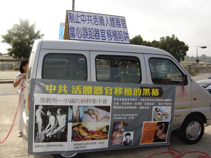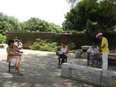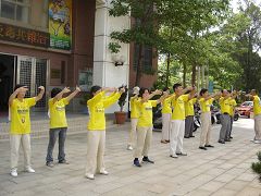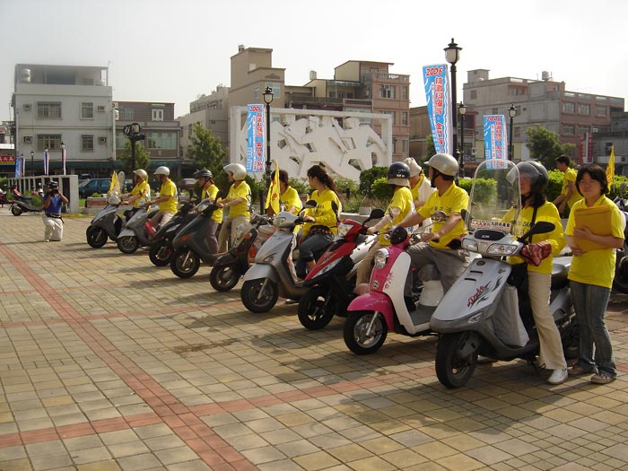 | 【明慧网2006年7月26日】历经国共八二三战役的金门战地(金门的对岸就是厦门),也是在台湾第一个与中国大陆三通(通航通邮通商)的地区,在2006年7月20日这一天,近三十位法轮功学员组成摩托车队,绕行金门县境,控诉中共活体摘取并贩卖法轮功学员器官的暴行。 由金门地区法轮功学员组成的摩托车队,于二十日上午在金门县立体育馆召开“SOS!制止中共活摘人体器官”的记者会。与会的台湾东海大学侯念祖教授控诉了中共暴行并说明这次活动的意义后,近二十部机车组成的车队开始绕行金门县境。除了金门县境外,车队成员也在县中心金城镇公所前演炼法轮功五套功法。过路的县民有的表达支持法轮功,有的痛批中共残暴。   金城镇公所前炼功 |