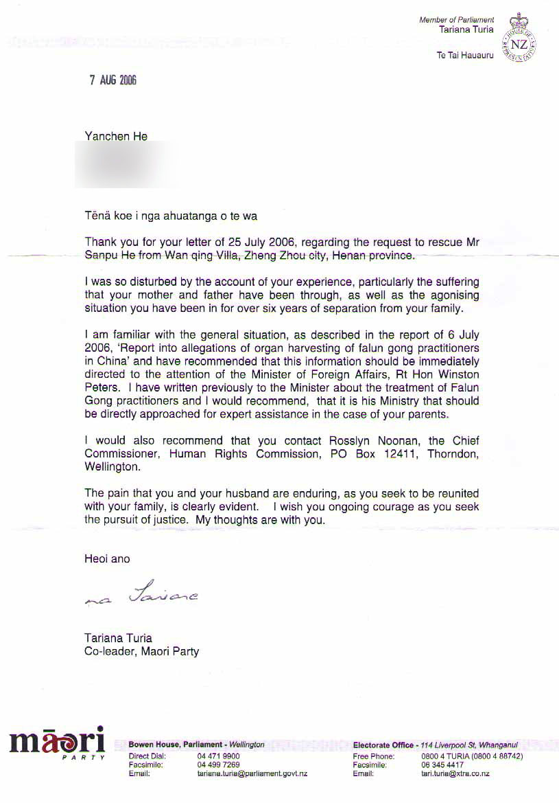 | 【明慧网2006年8月17日】近日,新西兰数名政要陆续致信法轮功学员和彦辰,表达对她父亲和三普因修炼法轮功而被非法关押在河南省郑州市晚晴山庄洗脑班一事的关注。 新西兰毛利党领袖Tariana Turia在2006年8月7日的回信中写道:“对于你们的经历,特别是你父母所遭受的一切,及你与家人6年不能团聚的痛苦情形,我深感不安。” “我了解(法轮功在中国的)整体境遇,如2006年7月6日‘关于调查指控中共摘取法轮功学员器官的报告 ’中叙述的情形。我曾建议这些信息应该立即送交外交部长温斯顿• 彼得斯,我也就法轮功学员的遭遇写信给外交部长。我建议对于你父母的情况,你应该直接和外交部取得联系,以获得他们的帮助。我还建议你和人权委员会主任专员联系。” “你和你丈夫为争取与家人团聚所承受的痛苦是显而易见的。愿你们在寻求正义的路上再接再厉。我的心与你们同在。” 新西兰外交部长温斯顿• 彼得斯(Winston Peters)在8月10日的回信中写道: “感谢你7月23日就你父亲被关押一事的来信和你给新西兰驻北京大使馆的电子邮件。新西兰驻北京大使已经和中国当局接触,了解你父亲的近况。外交部如果得任何消息,将会及时联络你。”  新西兰毛利党领袖Tariana Turia的回信 |