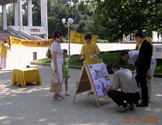 有时在集会现场执勤的警察由于受中共谎言的毒害,一开始对学员们带着防范和嘲讽的态度,可当他们看到大批的行人在法轮功学员面前停下脚步,关注迫害真相的神情,也走进来了解详情。当警察们看到法轮功学员是因为修炼真善忍做好人而遭受邪恶中共的残酷迫害,并且不管受到多么残酷的折磨,法轮功学员从来都不以暴制暴、以恶治恶,明白了真相的警察们都被触动了,其中有的表示也想修炼法轮功,并问能否也请一本《转法轮》。淳厚朴实的摩尔多瓦人看着真相展板和资料,被这些残酷的迫害事实惊呆了,很多人在一封呼吁摩尔多瓦总统,议会和政府采取紧急措施制止中共恶行的公开信上签下了自己的名字。