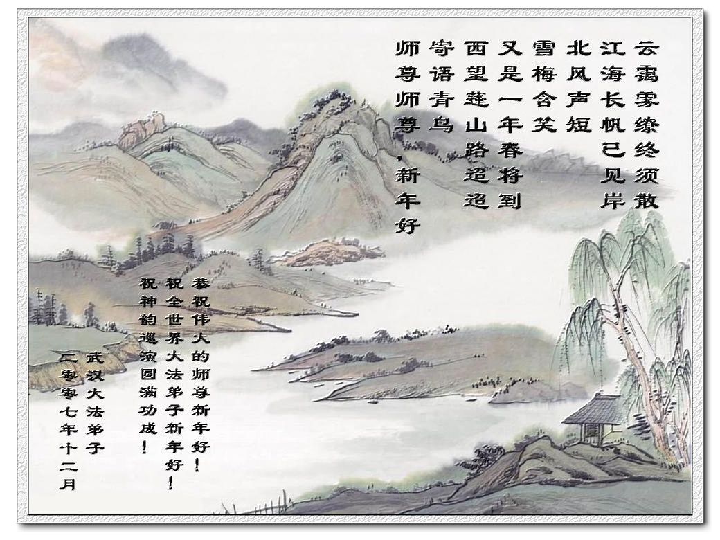 穹苍新宇迎新年 家乡法徒倍思念 遥祝师尊新年好 敬迎师尊回家园 飞雪迎春梅绽开 正念除恶神威显 苦海畅游救众生 助师正法了洪愿 待到法正人间日 普天同庆随师还 二零零七年十二月
