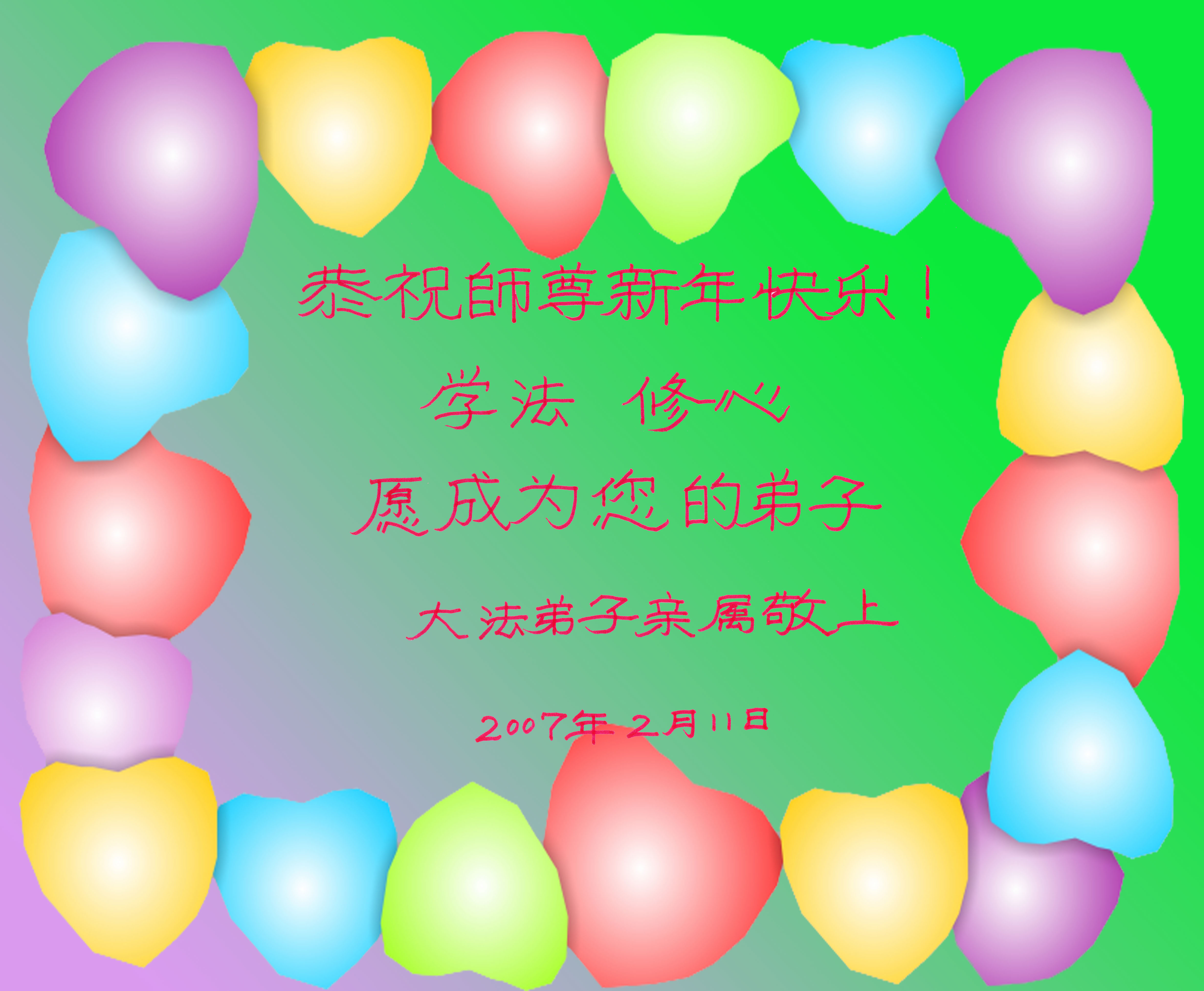 | 【明慧网二零零七年二月十八日】 一位大法弟子家属写给师父的拜年信 明白真相的浙江民众恭祝师父新年快乐 佳木斯市大法弟子的家人问候伟大的师父新年好! 大陆一家人祝师尊新年好! 桦川县大法弟子家属祝师尊新年快乐!向慈悲伟大的师尊问好! 河北省辛集市觉醒世人一家向大法师父问好 河北平山县大法弟子家人、亲朋、明白真相的世人恭祝尊敬大法师父过年好! 大法弟子家属敬祝李洪志老师新年快乐!感谢李洪志老师慈悲苦度! 被非法关押的大法弟子的家属向李洪志先生问声新年好! 昌黎县大法弟子家属向李洪志师父表示敬意和感恩! 大法弟子亲属恭祝师尊新年快乐! 吉林省白山市抚松县露水河明真相的人恭祝李洪志大师新年快乐! 一位大法弟子家属写给师父的拜年信