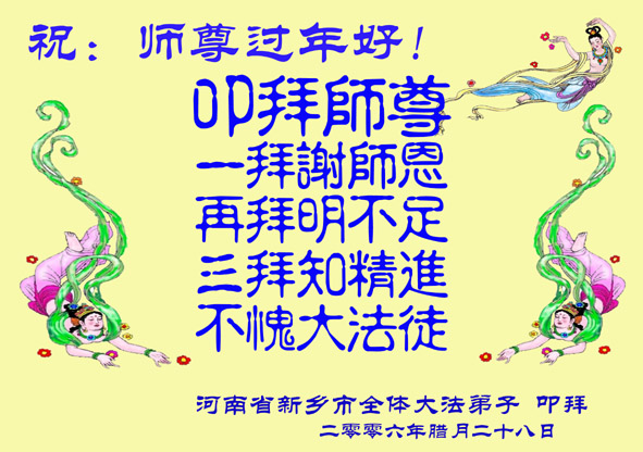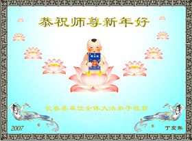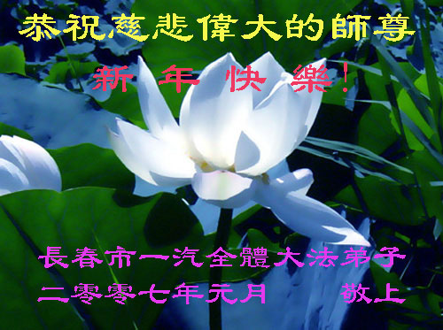 冬去就是春, 师父请放心。 转眼新年到, 含泪拜师尊。 我们没有更多的话要说,虽然弟子做的不好,但是我们发自内心的说一句:师父,新年好!师父辛苦啦!以后我们一定会做好师父交给我们的三件事,让师父少一些操劳,多一些欣慰。 唐县大法弟子 二零零七年二月十三日 长春某单位全体大法弟子恭祝师尊新年好