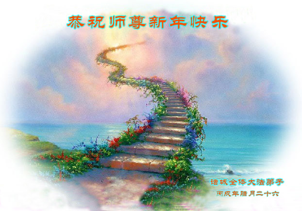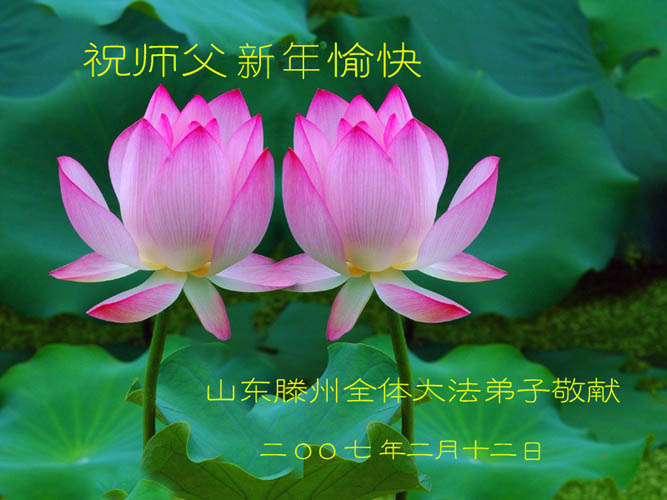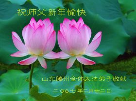 我们中国最隆重最喜庆的农历新年到了,我代表滕州市全体大法弟子向慈悲伟大的师父拜年!师父过年好!师父您辛苦了!我生长在北方可是我没有见过师尊,到滕州才得法,得法才三年,心里感到很遗憾。虽说我是得法时间不长的弟子,但我一定会放下所有执著,修去所有缺点与不足,做一名合格弟子,决不愧对正法时期大法弟子的称号。更不辜负师父的慈悲苦度。愿这新年的钟声给师尊带去我们遥远的祝福!祝师父新年快乐。!赋诗一首敬献师父: 恭祝师父新年好, 师父教诲心记牢, 精進做好三件事, 救度众生师尊笑。 师尊掌舵法导航, 扬帆破浪回家乡, 冲过艰难与险阻, 黑暗过后现曙光。 二零零七年二月九日 哈尔滨学府路大法弟子祝慈悲伟大的师尊过年好!