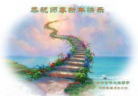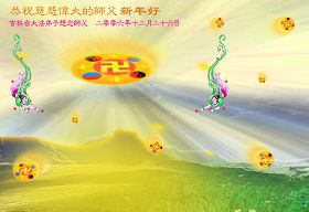 尊敬的师父:您好!我想了很多形容词来修饰师父一词,但无法找到能准确表达我心意的词语,您在我的心目中不是简单的可以用“敬重”二字就能概括的。 我不知道自己配不配做您的合格弟子(因为您告诉的三件事我虽然在做,但却没有时时刻刻将其作为人生最重要的事情在做,自感很愧对您的慈悲苦度),但我一直希望有那么一天能被您认可为合格的大法弟子。 马上要过大年了,很想送师父很多很多礼物略表我对师父感恩的一点点心意,却无法送达,只好通过网络给师父拜个早年,祝您新春快乐!谢谢您这么多年的教导和呵护,希望能有机会回报师父的恩情。请师父多多保重! 大陆一学员 浙江金华大法弟子祝慈悲伟大的师父新年!