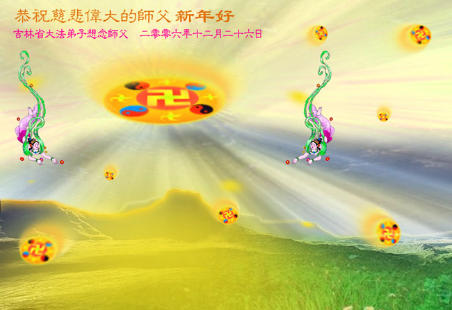 想念的师尊:您好! 我们是从未与师尊谋面的大法弟子,在修炼中深深感到师尊就在身边,而且时时看护着我们,我们每向前一步都凝聚着师尊的心血,都是在师尊搀扶下走过来的。虽则如此,我们还是非常遗憾。真心盼望早日与师团聚。师恩洪大,无以报答,只能远隔千山万水对师尊跪拜:绝不辜负师尊苦度之恩,我们要以学法背法为基础,以提高心性为根本,以救度众生为目地,在做好师尊要求的三件事中,勇猛精進! 在这辞旧迎新之际,让我们以无比想念的修炼人的敬师之心恭贺一声:伟大的师尊,新年快乐! 合十 横头山全体大法弟子 丁亥年正月初一 二零零七年二月十八日 吉林省公主岭市周边大法弟子恭祝慈悲伟大的师尊新年快乐!