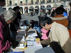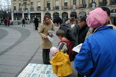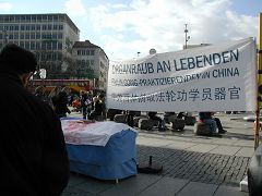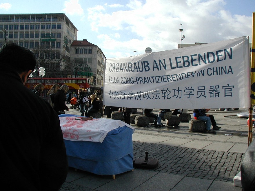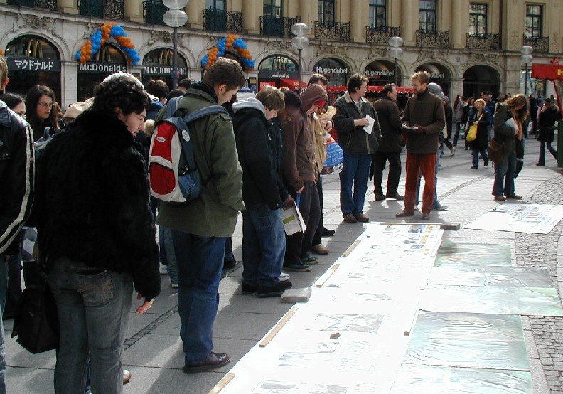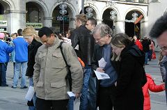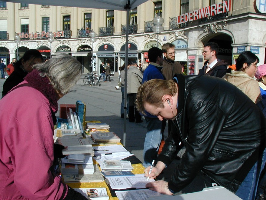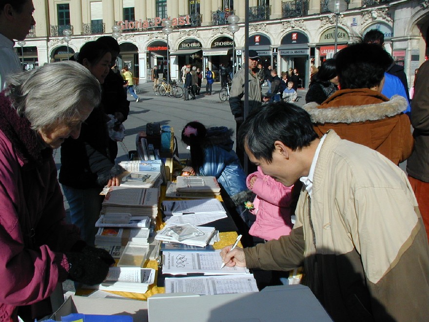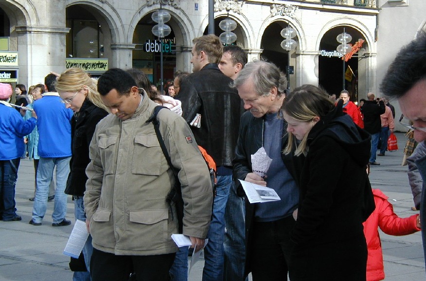 二零零七年三月十日,德国慕尼黑和周边地区的法轮功学员在市中心卡尔斯广场(Karlsplatz)举办活动,揭露中共对法轮功的残酷迫害,并声援一千九百万人退出中共。德国民众在观看了揭露中共活体摘取法轮功学员器官的模拟展和揭露中共暴政的展板后,纷纷签名,呼吁德国政府采取措施,制止中共的残暴行径。来自巴勒斯坦的策阿比·莫哈默德(Ziabi Mohamuad)是慕尼黑大学医学院的学生,他谴责(中共)这种行径,并认为这是非人行径。 中共气数已尽 自大.纪.元;社论《·九·评*共产党》问世以来,中国民众日益觉醒,认清了中共的真实面目,他们纷纷退出中共各种组织,目前每天退出中共的人数为三至四万,总人数直逼两千万。据全球.退:党!服务中心透露,中国大陆许多地区都出现了民众自发印刷发行的《·九·评*》和退!党!文献。中国有良知的维权律师,已经敢于公开在中共“法庭”上,揭露中共迫害法轮功学员和《·九·评*》传播者的非法性和荒唐性。这些事实说明:中共气数已尽,天灭中共在即,谎言和暴力已经挽救不了中共的溃烂和解体。 旨在挽救中国同胞 一天当中有不少来自中国的旅游者和留学生路过卡尔斯广场,他们中不少人认真的看揭露中共暴政的展板,并很认真的跟法轮功学员交换意见。有些华人认为家丑不可外扬,法轮功学员郑重的告诉他们,揭露中共这些邪恶的行径是为了在全世界曝光罪恶,让正义的力量去制止中共继续虐杀法轮功学员,目地不是为了推翻中共的政权,而是让中国和全世界更多的民众觉醒,摆脱中共的欺骗和毒害,旨在挽救中国同胞,使中国人不会在“天灭中共”之际为其陪葬。一些明白了真相的人当即填写了退出中共的声明。 一位华人女士手指一件蓝色上衣正在开怀的大笑,这是一件普通的衣服,正套在一位老年法轮功学员身上,衣服前后都印上了中文。前面为“退出中共、远离贪污、没有共产党、中国更美好”,后面是“退!党!、退!党!、快退!党!!”那位妇女笑了好久,边笑边说很想买一件,穿到天安门去转一圈。当场买不到同样的衣服,让她感到遗憾,可当她得到一个声援退!党!的徽章时,又马上高兴起来。