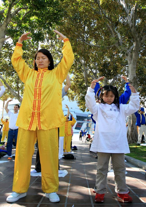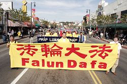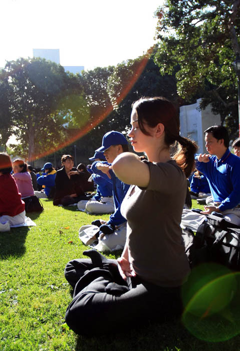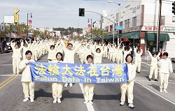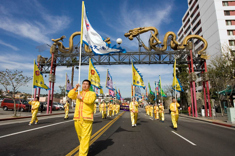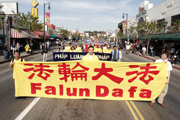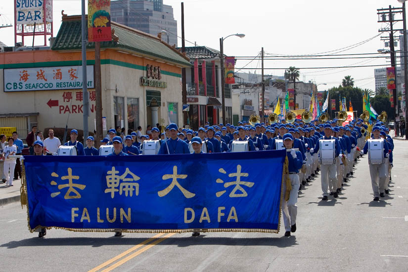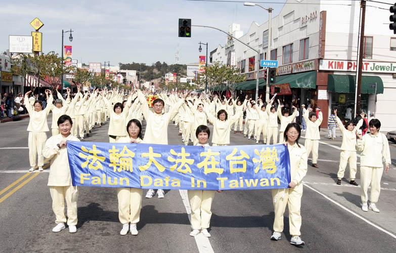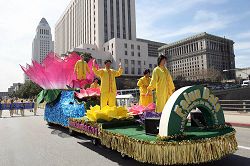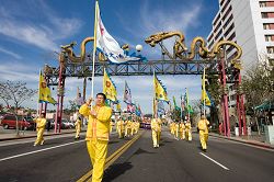 台湾法轮功学员组成的炼功队 | 法轮功学员一早就到达洛杉矶市政府大楼人权广场炼功当日洛城风和日丽,游行队伍从市政府大楼前的人权广场出发,沿着洛城主大道(MAIN STREET),穿越中国城。整个游行持续了两个小时,游行主题分三部份,包括大法洪传、反迫害和·九·评*退!党!队伍。 走在队伍最前面的是由约二百人组成的天国乐团、随后是法轮大法旗队、展示功法的百人炼功队和巨型大莲花花车;跟在揭露中共迫害法轮功的横幅后面的,是有百名身穿一身白衣的女法轮功学员手持花圈,悼念被迫害致死的中国大陆法轮功学员;之后是声援传·九·评*促三:退.,呼吁共同解体中共的队伍,和庆祝一千九百万民众觉醒退出中共的腰鼓队。游行队伍回到人权广场后结束。 壮观的游行队伍也吸引了美国主流媒体的注意。美国三大电视台之一的ABC电视台,也派出摄影师拍摄游行队伍。 洛杉矶地区法轮大法学会负责人李有甫表示,近来收到各界团体的来信,他们表示支持法轮功,并高度赞誉法轮功学员反迫害的勇气。“现在是越来越多人看清中共的邪恶,也看到了法轮大法的美好。” 大法真相渐入人心 游行途经唐人街时,不少华人都拥到人行道边,有的看着队伍微笑,有的赞叹游行队伍的整齐美好,了解真相的人纷纷谴责中共暴行。天国乐团和大莲花花车很受欢迎。来自香港的华侨曾女士说,自己很喜欢音乐,特别喜欢天国乐团的美妙音乐,她希望能有机会参加乐团。“游行太美了,我希望多了解他们,了解法轮功。” 唐人街周六停工的一家制衣厂前,有几位来自广州的女士挤到门口观看游行队伍。一位女士对记者说,很高兴在美国看到法轮功学员自由游行的场面,她说在中国大陆的家乡也有不少人在家里炼,希望不久的将来就可以看到他们自由炼功。 最近刚刚从中国大陆出来的李先生表示,他对法轮功学员所遭受的迫害感到同情和支持。对于法轮功学员的反迫害被中共称为“搞政治”,李先生说,“这是中共的造谣。好的就是好的,坏的就是坏的,法轮功学员只不过在坚持炼功信仰的权利,我相信日久见人心。” 一对来自德国的游客在赞叹游行队伍壮观的同时,他们说,现在很多德国人都知道了法轮功,也了解中共对法轮功的残酷迫害。德国人经历了纳粹时代,所以很多德国人非常支持法轮功学员的反迫害;希望迫害早日结束。 游行中的西方学员:远道而来是要呼吁制止迫害 游行队伍中,不少是在一九九九年迫害之后才开始修炼法轮功的西人。来自纽约的伊朗人Amir,修炼法轮功六年,最大的心愿是让更多人,包括家乡的人了解到大法的美好。他说,修炼法轮功让他更加健康和充满活力。目前伊朗也有不少人在修炼法轮功。Amir说:“中共想把法轮功消灭掉,但事实证明,法轮功在七年多的反迫害中,非但没有被打压下去,反而越来越多国家的人在修炼,这正好证明中共的邪恶,我相信人们会越来越明白法轮大法的美好。” Charles来自纽约长岛,身穿金黄的炼功服,在阳光下显得非常帅气。原来他是一位健身教练,非常喜欢气功,两年半前接触法轮功,他说:“法轮功是最好的,我找到了我想要的。” 新西兰裔厨师Gina表示,她已修炼三年,现在她感到头脑更加清醒和有力量。她说,她的哥哥和妹妹都在修炼法轮功,他们全家都喜欢法轮功。而自己特地从地球另一端远道而来,是希望停止在中国大陆发生的对法轮功学员的残酷迫害。