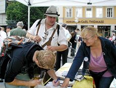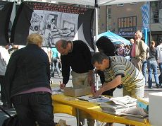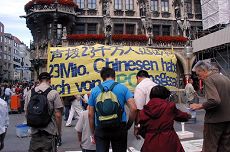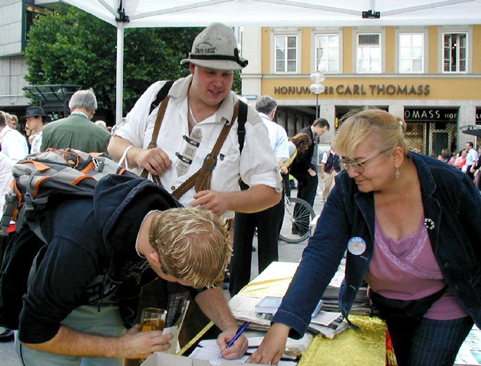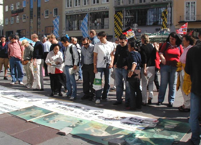 | 【明慧网二零零七年六月二十五日】(明慧记者德祥慕尼黑报道)二零零七年六月二十三日,法轮功学员在德国巴伐利亚首府慕尼黑(Munich)举办了声援两千三百万人退出中共的活动。 周末的玛琳广场挤满了熙熙攘攘的居民和游客,其中不少人的目光被摆在地上的图片展板所吸引,图片展示了中共建政以来对民众犯下的滔天大罪,包括中共为巩固其政权所发动的各类运动、迫害各个民间团体、破坏中华传统文化、活体摘取法轮功学员器官等等,将中共的邪恶本质暴露在光天化日之下。活动同时将中国的退党大潮信息带给各界,广泛传播《九评共产党》。不少民众观看完图片后,马上到展位前签名,敦促德国政府和联合国制止中共兽行——活体摘取法轮功学员器官。马林广场上亦有不少来自中国的官员和游客,不少人接过“九评”,也有人当场表示退团、退少先队。 在慕尼黑声援两千三百万人退出中共签名敦促德国政府制止中共活摘法轮功学员器官的兽行活动旨在唤醒人类良知 这两年来,在世界各地都可以看到类似的声援退出中共活动,旨在引起各国民众对中共残害生命的关注,唤醒人类的天良;同时,告诫各方,中共邪灵对整个人类道德的毁坏,在威胁着整个人类的安全。如果世界上有的政府为了经济利益,不顾人类道德的底线,在大是大非面前姑息邪恶,那么那个政府将后患无穷,神不会撒手不管,这样的政府也不会给民众带来福份。只有认清中共邪恶的本质,放弃对中共的幻想,在人命关天的时刻立场鲜明的表态,彻底清除这个邪灵,神才会保佑这样的民族。 一位在谴责中共活摘法轮功学员器官签名簿上签名的德国妇女告诉记者,她完全不能容忍中共的行径。她的先生目前还在中国工作,当她和先生的中国同事谈到中国人权问题时,他们多半不相信或不想相信。她从展台索取了《九评共产党》和麦塔斯与乔高关于中共活摘器官的调查报告,她希望她的先生能跟他的中国同事提及这一问题,这件事不应该只在国外被披露,而应该在中国内部让人了解。她希望中国人也能享受到世界上其它国家人都能得到的自由。 “你完全打开了我全新的思维” 一位天主教的神父告诉法轮功学员,在宗教和资本主义都不能彻底解决社会问题时,一些人开始寄希望于共产主义,包括他本人在内,都是抱着观察的心态在观望共产主义,希望能有个人人平等的社会,但是几十年来的实践证明,共产主义是失败的。 法轮功学员从共产党的邪恶本质上说开去,告诉他哪里有共产党,哪里的人民就遭殃、生灵就被涂炭,共产主义根本上就是邪灵。再说到中共为什么要迫害法轮功时,那位学员告诉神父,因为法轮功修的是“真、善、忍”,那位神父立刻就明白了,因为迫害“真、善、忍”的一定是邪恶的。当场他就在反迫害签名簿上签名,并告诉法轮功学员,共产党这个邪灵是一定要清除的,回去后他一定要好好看《九评共产党》。 后来神父感慨道,你作为一位东方人,完全打开了我全新的思维。法轮功学员告诉他:我今天跟你所讲的这些,都是从我们师父写的《转法轮》中学到的。神父马上表示要看《转法轮》,并跟学员要了炼功点的地址。