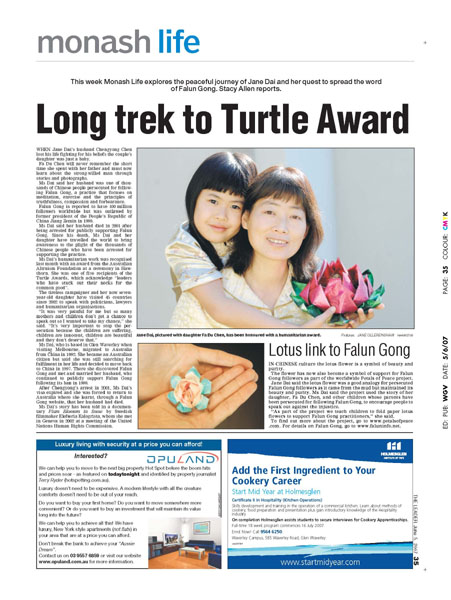 | 【明慧网二零零七年六月九日】(明慧记者章启明编译报导)澳大利亚利他主义基金会将零六年度人道主义奖项「海龟奖」颁发给戴志珍女士和她的女儿陈法度,以表彰她们多年来奔走于世界各地共计四十五个国家、为受中共迫害的法轮功人士和他们的子女呼吁的精神。澳大利亚领导者报(The Leader)记者Stacy Allen六月五日撰文介绍了戴志珍一家的遭遇及其为法轮功真相奔走的旅程。 *戴志珍母女为公众利益挺身而出获人道奖 文章说,当戴志珍的丈夫陈承勇因为坚持法轮功信仰而被迫害致死的时候,这对夫妇的女儿还是一个婴儿。陈法度永远都不会记得她和父亲在一起的短暂时刻,现在她必须通过故事和照片才能了解具有坚强意志的父亲。 戴女士说她的丈夫是成千上万因为坚持法轮功信仰而被迫害的学员之一。法轮功强调打坐,炼功和“真、善、忍”的原理。据报道全球有一亿人修炼法轮功,但一九九九年受到前中共党魁江××的迫害。 戴女士说她的丈夫于二零零一年因为公开支持法轮功而被拘捕后死亡。自丈夫去世后,戴便携带女儿奔走于世界各地呼吁公众关注成千上万的中国人因为支持法轮功而被拘捕的不幸遭遇。 戴女士的人道主义工作上个月受到澳大利亚“利他主义基金会”的奖励,褒奖仪式在毫桑(Hawthorn)举办。她是五名海龟奖的获奖者之一。该奖用于表彰“为了公众利益挺身而出的领袖人物”。 不知疲倦的戴女士和她七岁的女儿自二零零二年以来已经走访了四十五个国家,与众多政治家,律师和人权组织交谈过。 戴女士表示,这对她来说很艰难,但是许多母亲和孩子没有机会向公众诉说,因此她想抓住这个机会。她说:“制止这场迫害很重要,因为孩子们正在遭受痛苦,他们是无辜的,他们是美好的,他们不应当遭受痛苦。” 戴女士来到墨尔本时住在格林•威沃雷(Glen Waverley),她于一九九二年从中国移民澳大利亚。成为澳大利亚公民以后,戴女士仍然追寻生活的目标并于一九九七年决定回到中国,在那儿她找到法轮功并与自己的丈夫相遇和结婚。她的丈夫在一九九九年法轮功被迫害以后依然公开支持法轮功。 二零零一年陈承勇被捕以后,戴女士的中国签证过期,她被迫回到澳大利亚,后来在一个法轮功网站上看到丈夫去世的消息。 戴女士的故事已经被瑞典电影制片人艾利福特瑞•克劳奎斯特(Elefteria Kalogrista)拍成记录片《傲雪梅花》(Plum Blossom in the Snow)。戴是在二零零二年日内瓦人权会期间认识这位制片人的。 *莲花与法轮功 在中国文化中,莲花象征美丽和纯洁。现在作为“和平花瓣”工程的一部份,莲花已经成为支持法轮功的一个象征。 戴女士说莲花是对遭受迫害的法轮功学员的很好的比喻,因为莲花出淤泥而不染,保持美丽纯洁。戴女士说,“和平花瓣”工程用她女儿陈法度和其他受迫害法轮功学员孩子的故事来鼓励人们直言反对(对法轮功的)不公正待遇。 戴女士说,“我们教孩子们折叠莲花来支持法轮功学员。”