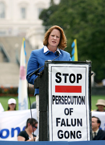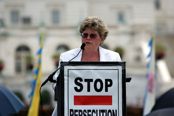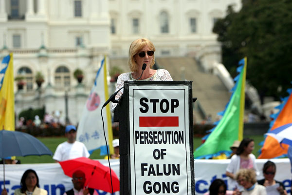 美国宗教与民主协会信仰自由(The Institute of Religion & Democracy)计划主任费斯•麦克唐纳尔(Faith J.H. McDonnell)女士在集会上发言。 |