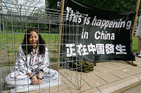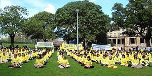 报道开头介绍说,他们是一组常来的安静的抗议人士,警察通常不去管他们,甚至在这个保安很严的星期也是这样。 这次悉尼亚太峰会期间,法轮功学员和支持者们天天有集会,直至星期日。警察批准了所有的法轮功学员的抗议活动。今天是他们规模最大的集会,超过四百人聚集在海德公园。 报道说,抗议者再次演示了中共政权的“迫害史”。扮成中共士兵的男子,站在化了妆看起来象受到严重殴打的被关押者身后。孩子们扮演劳改所里的囚犯,移动一堆道具砖头。演出中特别令人毛骨悚然的血腥的场面,是一位妇女躺在手术台上,器官被摘取。 这次集会的发言人约翰•戴勒(John Deller)说,支持者们指控中共政权酷刑折磨、虐杀法轮功学员,摘取他们的器官。 戴勒说:“中共正在迫害及虐杀法轮功学员,试图铲除法轮功”。 报道中描述,在舞台前,一百五十多名身穿黄色或蓝色衣服的法轮功支持者们安静的站着,许多人手举横幅呼吁制止迫害法轮功。另一组大约十五个抗议者穿着丝绸衣服围成一圈在舞台一边跳舞,在舞台后面,其他支持者手持横幅站立着。 在通向海德公园喷泉的人行道上,该团体摆放了许多展板,图示中共用在法轮功学员身上的酷刑手段。 报道接着介绍说,法轮功[学员]的集会一直是和平的。他们每天在悉尼中国城都有一个资讯摊位,他们也有其他支持者经常环城散发传单。