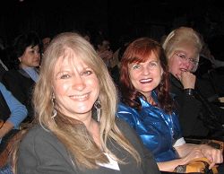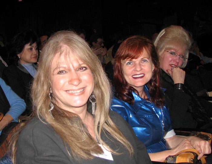 | 【明慧网二零零八年一月二十二日】(明慧记者苏青拉斯维加斯采访报道)“非常令人鼓舞!所有的歌曲、音乐,整个演出都非常的令人鼓舞!”作家和职业歌唱演员Carla Masterson在二零零八年新唐人全球华人新年晚会拉斯维加斯场的中场休息时这样对记者说,“每个节目都很特别,我没有办法挑出哪一个是我最喜欢的。(观看演出)真的是一个美妙的体验。” Carla Masterson曾是位职业歌唱演员,七八十年代在拉斯维加斯各大酒店表演。九十年代她开始写作,第一本书是关于情感的儿童读物“What’s On The Other Side of The Rainbow”。二零零六年,她成立了自己的出版公司,正在出版她的七本著作。  作家Carla Masterson(左二)和资深记者和娱乐评论家Bobbie Kats(左一)都非常喜爱神韵的演出