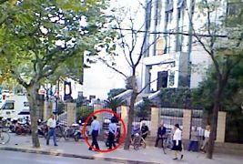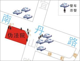 法院周边地图以及非法庭审时的警车、警察部署示意图以下是现场摄取的一些照片。除照片中的警车外,还有两辆装备精良,车顶有拍摄设备的警察在周围路段巡逻。  法院对面宜山路和南丹路街角的巡视恶警 |  法院对面宜山路和南丹路街角的巡视恶警 |