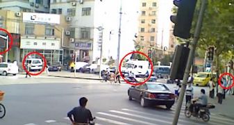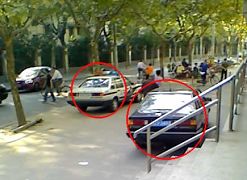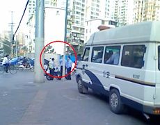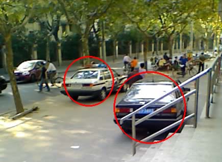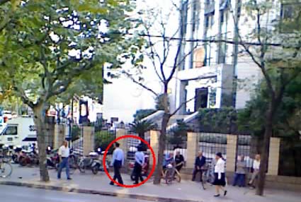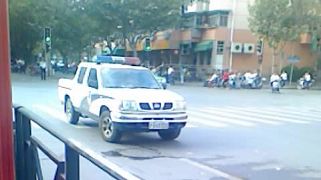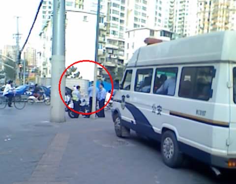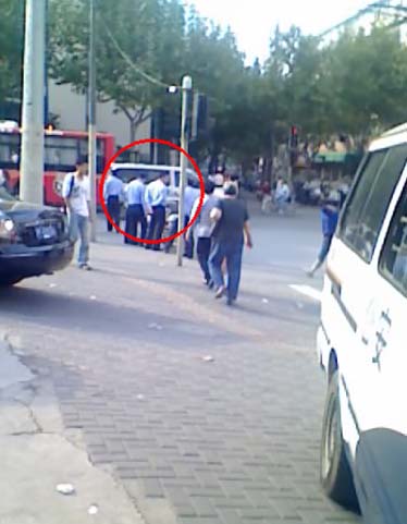 在法院马路对面的警车和法院正门口的警察及和他说话的三名便衣(2男1女) |  在南丹路宜山路绕法院往返巡逻的恶警 |