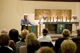 【明慧网二零零八年十月二十六日】(明慧记者吴思静柏林报道)“坚韧不屈的精神”画展于二零零八年十月二十四日在位于柏林市中心Moabit区的海兰德教堂(Heilandskirche)开幕。这次画展共展出二十多幅作品,包括油画和雕塑。参展美术家来自世界各地,有不同的文化和社会背景,其共同点在于他们都是法轮功修炼者。  画展主办者德国“艺术和人权协会”会长第茨先生向人们解说法轮功学员如何被中国警察强制灌食。 |