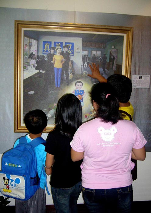 因为工作的关系,郑以甄有较多的时间和小孩相处,最能感受到孩子的纯净和真,孩子心里想什么,表现出来的就是什么,美展的每一幅作品都能让人感受到这份难得的纯真。 郑以甄最喜欢姚崇琪的《抄家》。面对恶警抄家,机灵可爱的小弟子知道是迫害,手里紧紧抱着《转法轮》想藏起来。胖胖的身体,跨出去的脚步看起来不是很稳,但跨出的那一步非常大,给人感觉很有希望。郑以甄赞叹,虽然是一幅静态的画,给人的感觉却是活的,有生命的。 「人对人怎么可以这么残忍?」郑以甄看到法轮功学员因为坚信「真、善、忍」被中共残酷的迫害,而且迫害还在中国大陆持续发生着,实在太令人震惊。画作背后真实的故事让郑以甄很难过,但她觉得一定要把真相告诉大家,修炼人的「真」就是一股最大的力量,修炼人的「真」可以告诉世人真相,「真」令人感动,「真」可以克服一切造假。
