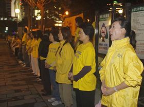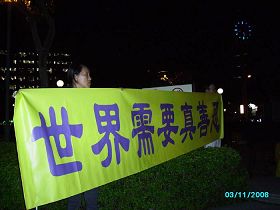 【明慧网二零零八年十一月四日】二零零八年十一月三日,大陆海协会会长陈云林抵达台湾首日晚间,由海基会于台北101大楼设宴招待。晚宴结束后陈云林步出101大楼外接受媒体访问,近二百位法轮功学员向其高喊「法轮大法好」、「停止迫害法轮功」。当电视上转播出法轮功学员向陈云林喊话的画面时,驻在圆山饭店新闻中心的中外媒体都肯定,他们说:「好啊!」「不过就是炼功嘛,干嘛抓人!」